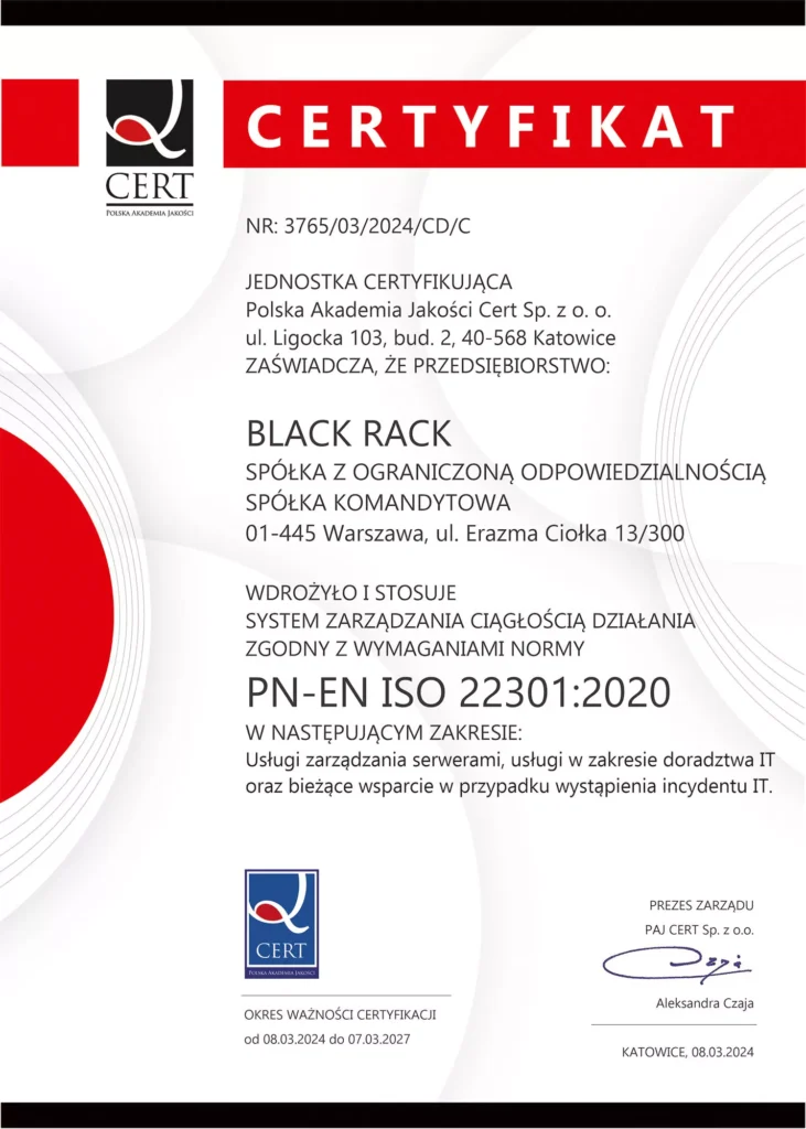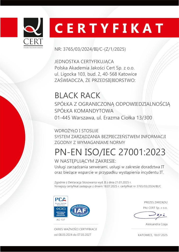 Nasza firma posiada certyfikaty ISO w zakresie „Usługi zarządzania serwerami, usługi w zakresie doradztwa IT oraz bieżace wsparcie w przypadku wystąpienia incydentu IT.”